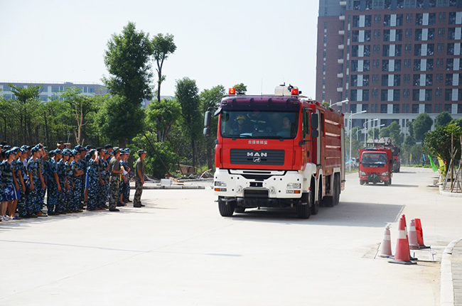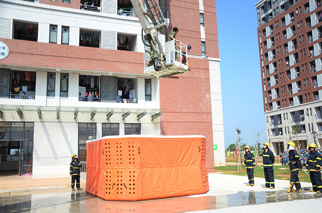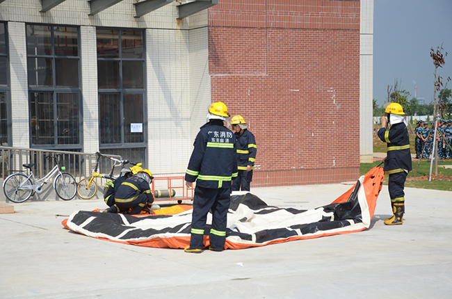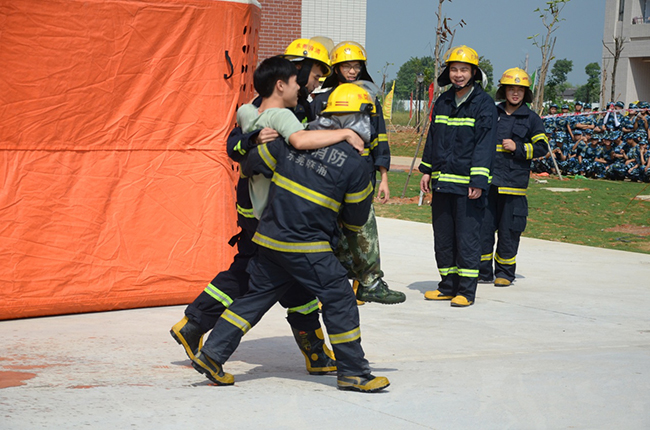随着教官的一声令下,演练正式开始。在教官的指引下,军训学员们按指定路线迅速撤离危险地带。“被困”学生在宿舍阳台上等待消防人员的救援。这时消防官兵和医护人员各司其职,通力合作,分别通过云梯、气垫等方式实施救援,最终成功解救“被困”学生。