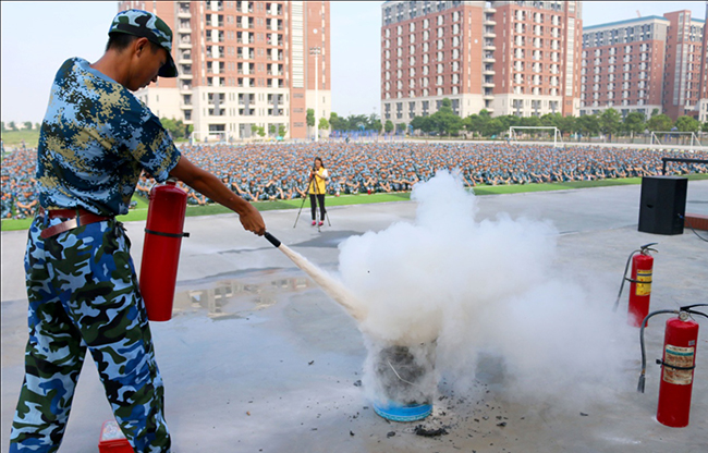 在消防官兵的指导下,多名同学亲身实践如何使用干粉灭火器。消防官兵们也对同学们的操作进行了及时点评。