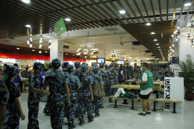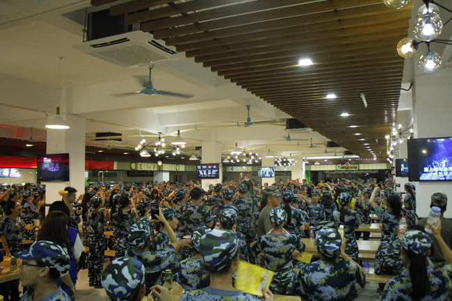 工作人员来来往往,在派送糖水之余与新生们欢快交谈。教官也卸下了白天的严肃模样,与学员们频繁互动。