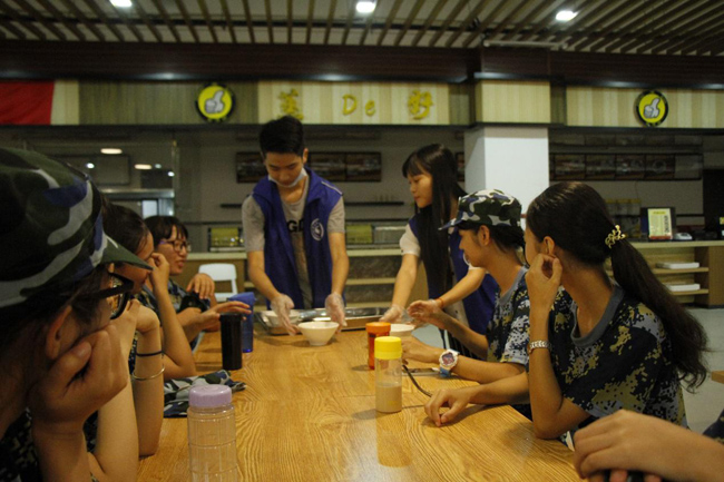 晚7时,活动工作人员陆续到场。配合默契的工作人员把一碗碗糖水盛好添上汤匙并有序的摆放在桌子上,等待着军训方队的到来。