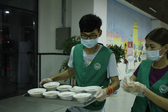9月23日晚,为慰问白天在艳阳下艰苦训练的2015级新生,中大新华学院学生会在我院东莞校区新食堂开展新生慰问活动,活动形式主要为向新生派送糖水。