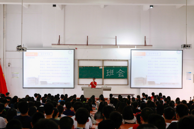 9月14日下午,财会系主任张丽拉、财务管理专业副主李安兰及会计学专业副主任林源为财会系2015级新生开展入学教育班会。