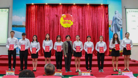 我校召开2018年暑期“三下乡”社会实践活动表彰大会,我校党委周云书记(中左)为“优秀调研报告奖”获奖代表颁奖