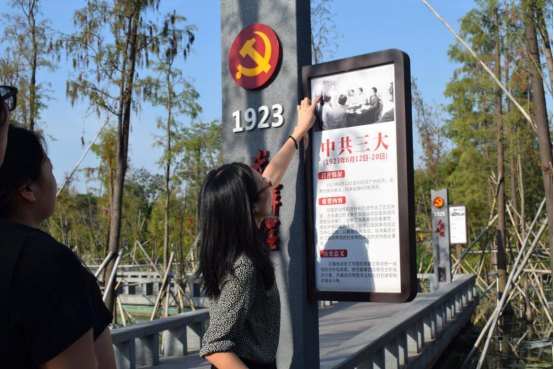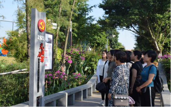 华阳湖党建主题公园从大树广场一直延伸到市民广场,沿途每隔数米设置展示牌。展示牌内容主要包括“党的光辉历程”、“社会主义核心价值观”、“党的路线方针”、“党建知识”及“廉政文化”等。其中第一块展示牌介绍了中共一大的主题背景,为师生党员们展现了开天辟地、敢为人先的首创精神,坚定理想、百折不挠的奋斗精神,立党为公、忠诚为民的奉献精神,伫立在前彷佛身临其境,让人瞬间感到热血沸腾。