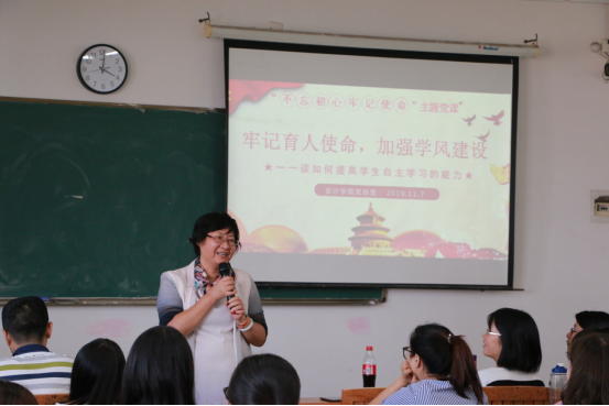 11月7日,会计学院党总支于定静①C405举行“如何提高学生自主学习能力”主题教育专题党课,本次党课由会计学院党总支书记张丽拉同志主讲,党总支副书记王沣,党总支委员、常务副院长林源,副院长李安兰及各党支部师生党员代表参加。