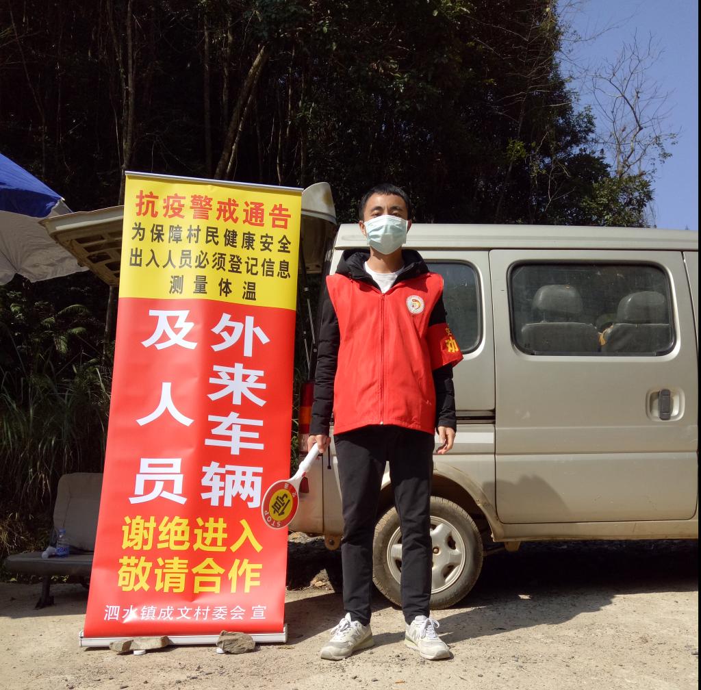 李城同学驻守村口检查点,协助出入人员测量体温并登记信息
