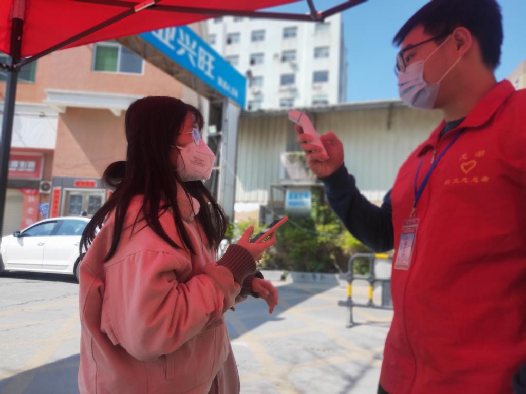 纪思旭同学(右)为出入小区人员测量体温