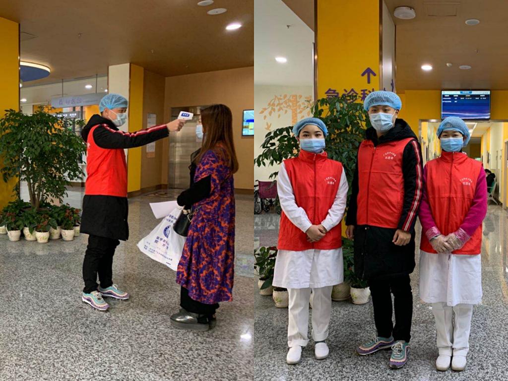 乔星铭同学(左一、右中)为医院出入人员测量体温
