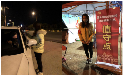 会计学院学生第二党支部入党积极分子罗艳芳同志作为广州市从化区鳌头镇白兔村村委监测点的一名志愿者,臂戴红袖章,面戴医用口罩,手握体温枪,在寒风中坚持“逢车必检,逢人必查”,为每一个入村的村民测量体温。面对疫情,她选择坚守在疫情防控志愿工作一线,以实际行动支援在最前线抗击疫情的“白衣战士”们。