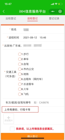 新生来校报到前,须在iXH小程序“返校登记”功能中进行报到申请,按照实际情况如实填报来校报到信息,上传“粤康码”和“行程卡”截图,填写完成后提交给院系辅导员审核,院系审批通过后,学生方可来校报到。节省了到校后的审批流程,提高了报到效率。报到当日,学生只需要在校门口完成体温检测后,即可凭借iXH健康码绿码轻松“扫码入校”,跟随志愿者实现专业报到点和宿舍楼“两点一线”。