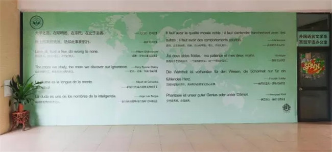 在新华,总有那么一个安静的角落,经过的新华人,都情不自禁地放慢了脚步驻足于前,细细品味墙上的真理名言,稍不留神就会陷入对人生的沉思以及对生命的思考。除了选自《大学》的,“大学之道,在明明德,在亲民,在止于至善。”和陆游在《冬夜读书示子聿》一诗中“纸上得来终觉浅,绝知此事要躬行。”这两句中文选句外,还包括莎士比亚,塞万提斯,孟德斯鸠,康德等英、西、法、德四种语言的名言选句。西班牙语选取了世界名著《堂吉诃德》作者塞万提斯的“La pluma es la lengua de la mente. (笔是思想之舌)”,以及阿根廷著名诗人博尔赫斯的“La duda es uno de los nombres de la inteligencia. (疑问是智慧的名字之一)”,展现西班牙语简洁有力、韵律轻快的特点和西班牙语文学大家的思想和眼界。