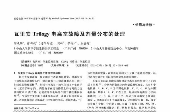 其中我院2013级的陈展麟同学就其见习期间所接触到的放射治疗设备维保工作中遇到的故障修复问题展开研究,在导师的支持和指导下写出了《瓦里安Trilogy电离室故障及剂量分布的处理》一文,并在国内核心杂志《医疗装备》发表。
