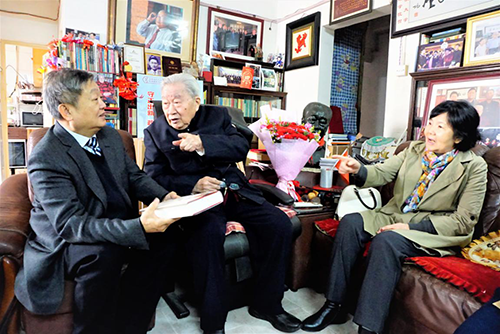2019年1月27日,正值夏书章教授(以下称夏老)百岁华诞之际,中山大学新华学院校长王庭槐(以下称王校长)、党委书记周云(以下称周书记)一行人来到我国当代行政学奠基人、“中国MPA之父”夏书章教授家中拜访。王庭槐院长与夏书章教授就中山大学新华学院(以下简称学校)新一年的办学思路、方向、发展等展开深入交流。
