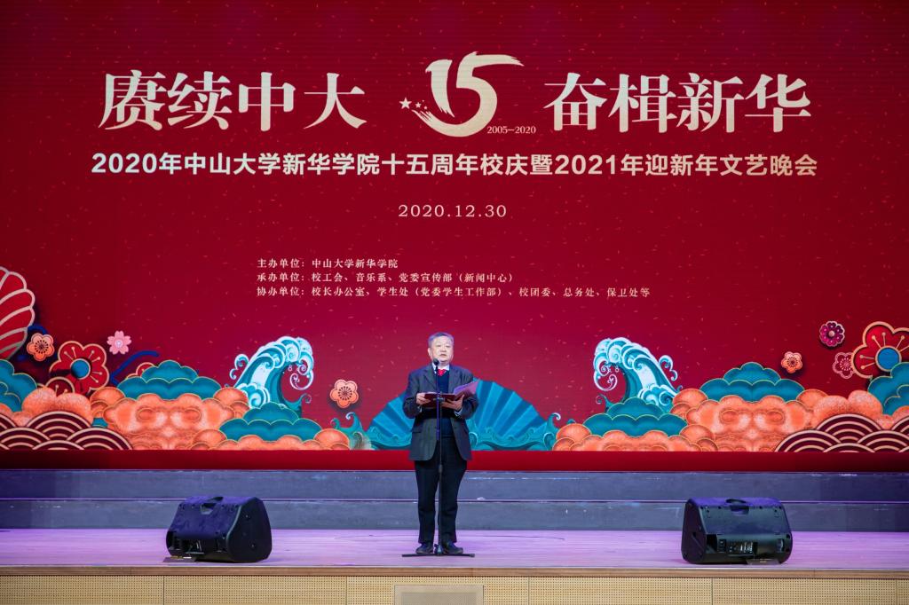 时光荏苒,岁月如歌,我们在发展中迎来建校十五周年。今晚,校园内外洋溢着节日的喜庆,我们欢聚一堂,共同庆祝中山大学新华学院建校十五周年。过了明天,我们还将迎来2021年的新年钟声。在这欢庆的日子里,我们回忆十五年建校的峥嵘岁月,满怀对新一年的无限憧憬,举行中山大学新华学院十五周年校庆暨迎新年文艺晚会。首先,我谨代表学校领导班子,向一直以来在教育教学、科研创新及管理服务等各个岗位上辛勤耕耘的全体教职员工致以良好的祝愿和崇高的敬意。