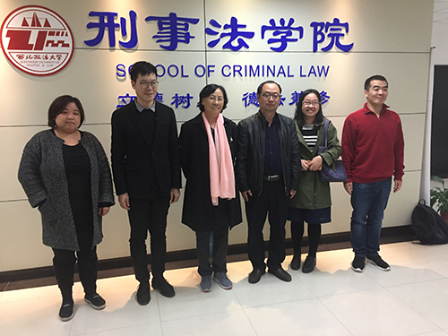 西北政法大学刑事法学院教务杜丽萍老师(左一)、副院长宋志军教授(左二)、院长冯卫国教授(右三)、冉巨火副教授(右一)与我校调研组成员合影