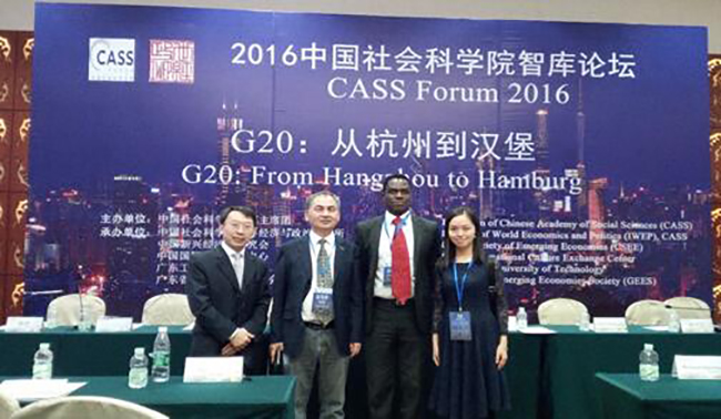 吴喜龄老师(右一)与广东新兴经济体研究会会长蔡春林教授(左二)和东南非洲共同市场(COMESA)副主席理查德•圭尼亚(右二)合影