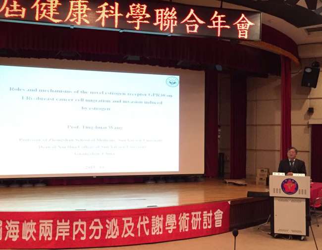中山大学新华学院院长、中山大学医学部副主任、国家教学名师王庭槐教授作为首届海峡两岸内分泌及代谢学术研讨会第一副主任委员赴台出席了此次研讨会,并在会上作了以《雌激素受体GPR30在雌激素促进ER阴性乳腺癌细胞MDA-MB-231迁移和侵袭过程中的作用及机制》为题的学术报告。