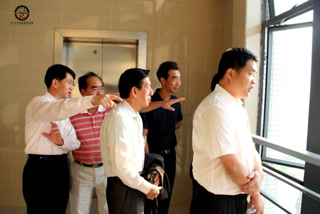 图1 我院蓝永金副院长(左一)向调研组专家们介绍校园建设规划蓝图