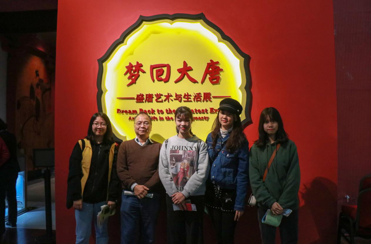 胡教授(左二)与师生共游“盛唐艺术与生活展”