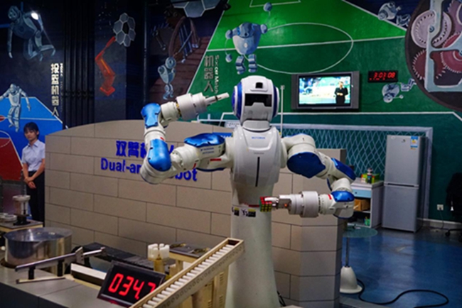 具备人性化的机器人完成系列动作后做出敬礼的动作