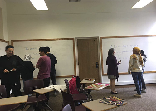 考虑到语言问题,拿大国际学院为访问学者提供6周的语言课程观摩,我首先申请了《Oral EnglishⅡ》、《Pronunciation》和《Language Lab》三门语言课程。在“Oral EnglishⅡ”课上,相比美国学生或中东地区的留学生,中国留学生课堂表现相对安静、内敛。来自美国的Christopher教师备课认真充分、教学目标明确,他不希望自己的课堂枯燥乏味,希望能与学生有更多互动,因此常有多种形式的分组活动以丰富课堂,吸引学生注意力,提高学生的课堂参与度,教师则在旁指导监督。