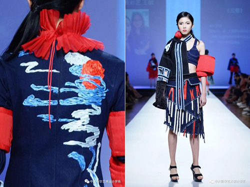 麦彩芝和王敏同学也特别感谢邵老师的指导,她们的优秀系列作品——《云里》服装以仙鹤,云腾,灯笼等中国传统元素为灵感,将现代拉链的拆合、传统刺绣的“织带秀”、特别的灯笼袖子等创意想法融汇于服装当中,使作品更具视觉冲击力。由于复杂的板型与繁琐的工艺,在制作过程中难免会遇到工艺瓶颈,但通过邵老师耐心的讲解与现场指导,她们反复修改细节以后,整个系列作品显得更加精致,美妙绝伦。