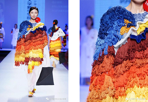 邵诗茹老师说,为了让学生在做《日暮》这份毕业设计的时候更好的理解秀场的涵义,她给同学们看过很多国外秀场的照片,引导学生去理解、体验:秀的本身是表演性质,不可以做的太过于成衣化。邵老师还鼓励他们做一些有廓形的作品,包括多做一些手工面料,再造一些机理的效果。