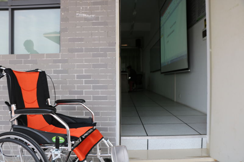 赵慧青老师在带伤坐轮椅的情况下坚持给同学们上课