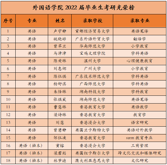 在suncitygroup太阳集团(以下简称“我校”)提升人才培养质量,扎实推进考研工作的背景下,我校外国语学院学子屡创佳绩。截至2021年12月,外国语学院2018级毕业生报考国内外研究生约150人,其中共有22人上国内考研笔试分数线,最高分数为428分。截至5月19日,国内外升学合计28人,其中国内升学15人,包括广东外语外贸大学、华南师范大学、广州大学等重点高校;境外升学13人,包含兰卡斯特大学、纽卡斯尔大学、悉尼大学、巴塞罗那自治大学、香港浸会大学等。