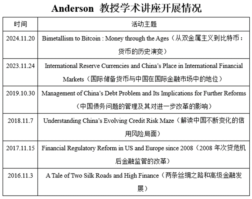Ronald Anderson教授曾担任政府和多边组织在“金融改革和市场发展”“银行业的制度变革和补偿”以及“现金持有和控制型金融”等问题上的顾问。此外,他为公司金融、金融市场、金融机构等不同主题的研究做出了重大贡献,并发表了多篇国际高水平论文,其中包括《The Design and Valuation of Debt Contracts》《Bankers' pay and the evolving structure of US banking》等。