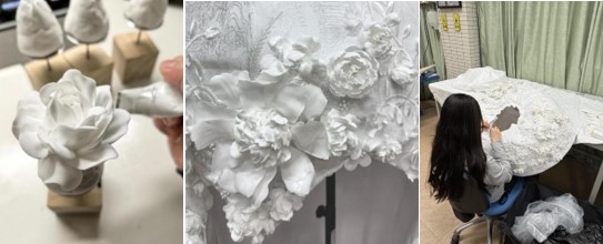本系列以“白”为主题展开三款女装设计,聚焦白瓷的纯净质感与女性身体曲线的共生关系。采用挂脖抹胸上衣,裙身以硬衬塑造仿瓷瓶直筒廓形,采用超轻粘土模拟瓷花,裙身表面叠加浮雕花纹刺绣,通过收腰设计凸显腰部曲线,裙摆边缘嵌入铁丝,整体造型虚实对比强烈,兼具传统韵味与现代时尚。
