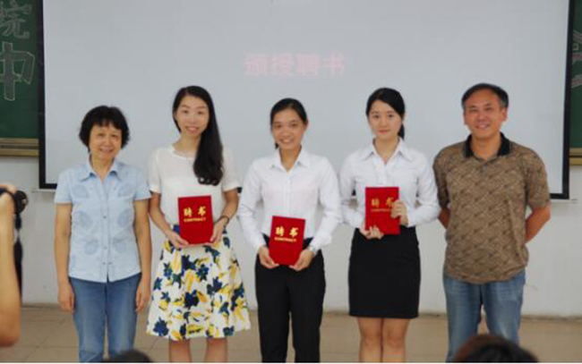 杨帮琰副主任(左一)、刘英老师(右一)为学生记者代表颁授聘书