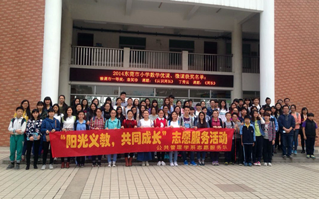 为了更好地倡导团结友爱、助人为乐、乐于奉献的社会风气,树立奉献、友爱、互助、进步的时代新风范,公共管理学系志愿服务队继续与麻涌镇中心小学合作,由2015年4月初至6月中旬开展东莞校区第三期“阳光义教,共同成长”志愿服务活动,为小学生解答疑难和解决学业上的问题,以帮助他们更好的冲刺初中。