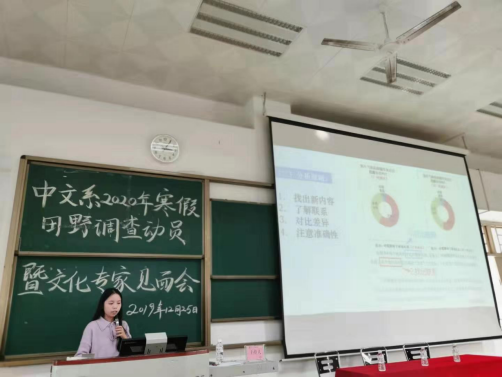 12月25日,中山大学新华学院中文系(下文简称“中文系”)召开了2020年寒假田野调查动员暨文化专家见面会。广东省社会科学院文化产业研究所副所长(主持工作)、研究员詹双晖和广东省社会科学院文化产业研究所助理研究员揭英丽受邀出席。中文系李铭建副主任、程露副主任,党总支杨帮琰副书记,文化教研室教师,2019级辅导员、班主任及2019级全体学生参加了此次会议。