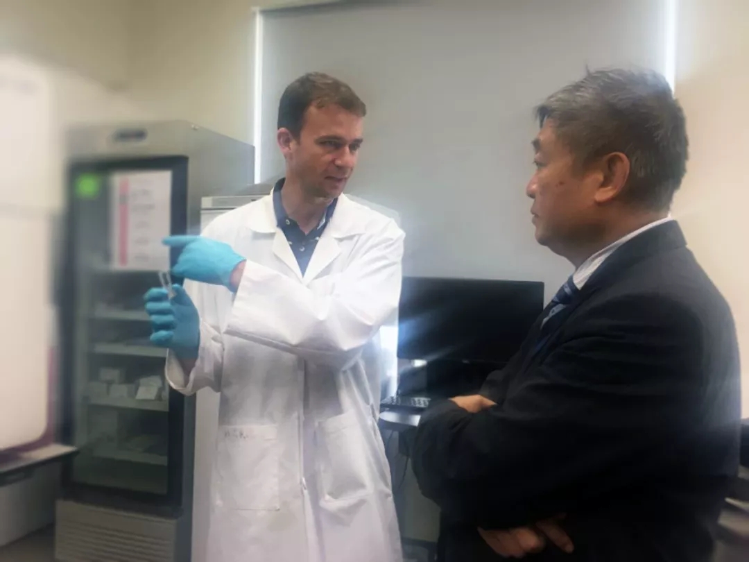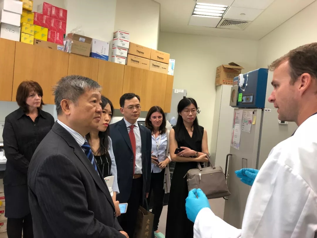 纽约大学阿布扎比分校实验员正在为我校代表团讲解遗传疾病基因筛查工作的进展情况