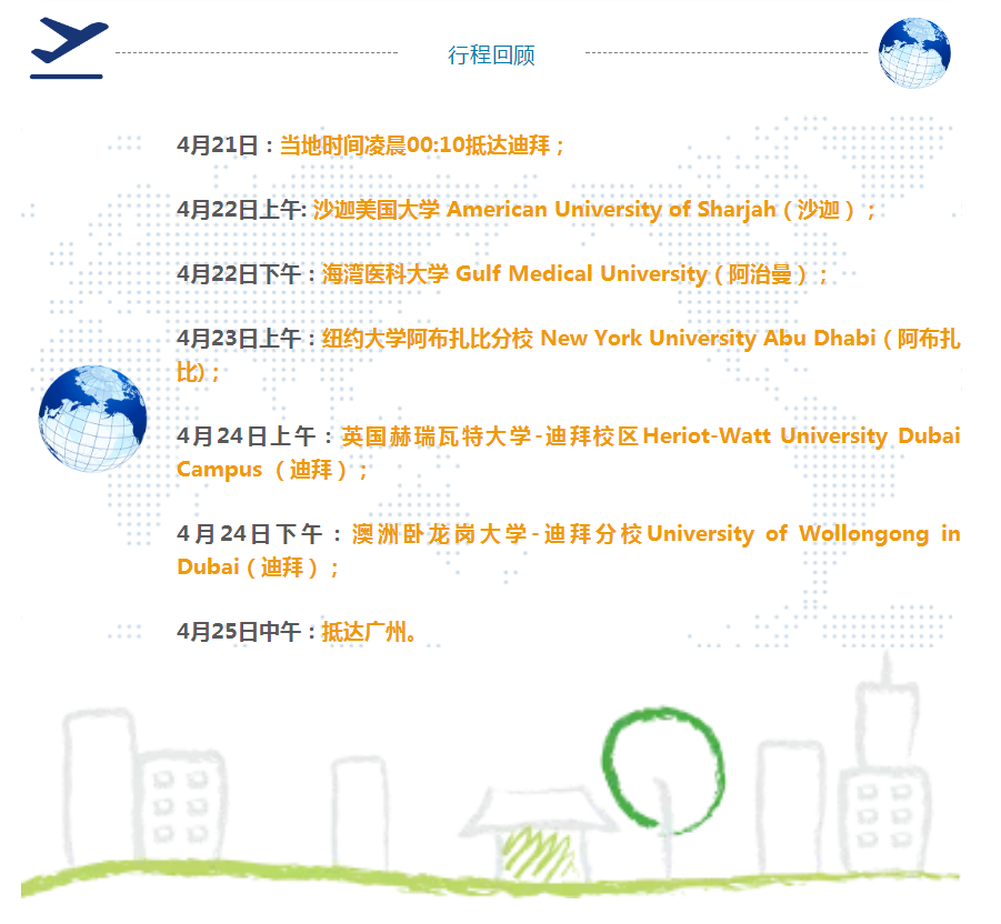 4月21日至4月25日,中山大学新华学院代表团校长王庭槐、校长助理刘婉莉、经贸学院副院长周开国、药学院办公室主任曹颖男一行四人应邀访问了沙迦美国大学、海湾医科大学、纽约大学阿布扎比分校、英国赫瑞瓦特大 学-迪拜校区、澳洲卧龙岗大学-迪拜分校。
