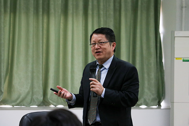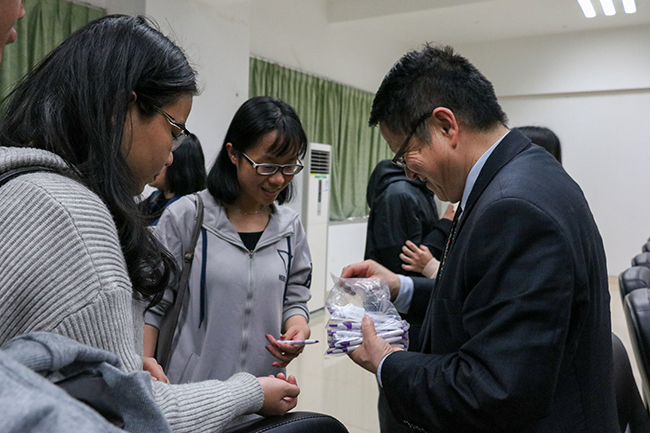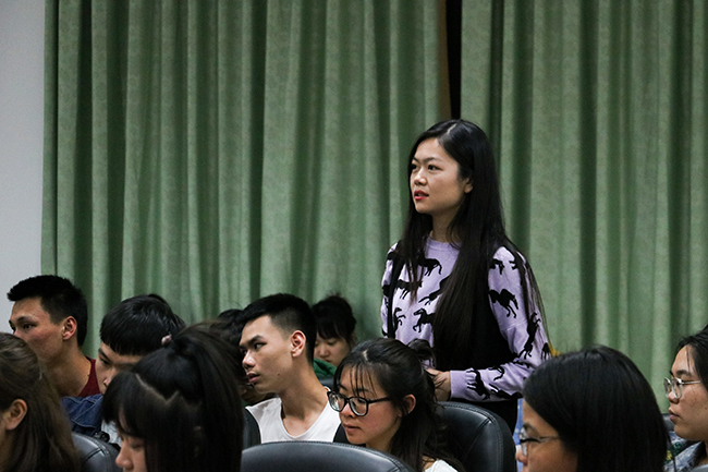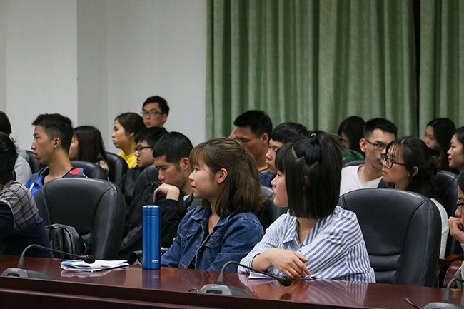宋教授列举了历年来两校合作留学项目的情况,为同学们展示了拿大的校园风光,介绍了院系设置等情况,对同学们提出的有关拿大留学项目的问题一一作出细致认真的解答,并为同学们发放拿大校园纪念品。