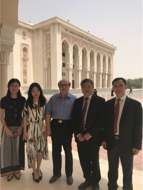 (左起:我校药学院院办主任曹颖男、校长助理刘婉莉,阿联酋沙迦美国大学副校长赵伟,我校校长王庭槐、经贸学院副院长周开国)