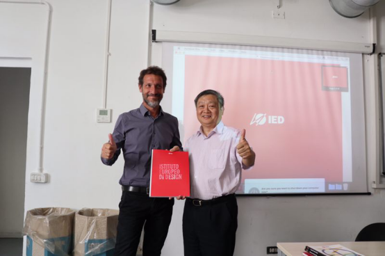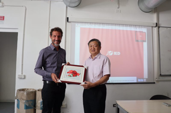 我校校长王庭槐(右)向欧洲设计学院董事长Federico Caravaggi先生(左)赠送纪念品