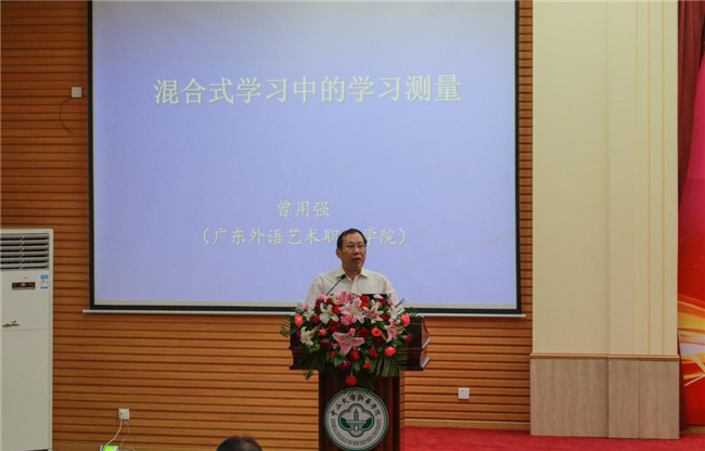 广东外语艺术职业学院院长曾用强教授作“混合式教学中的学习测量”专题学术报告。曾教授指出,我们正处在信息化发展时代,信息技术已深度融入各领域。“互联网+教育”正在改变教育的方方面面,其中最重要的改变是:“课本+课室”的传统教学生态被打破,一种全新的教学生态正在形成,即混合式学习(Blending Learning)。所谓混合式教学就是把传统学习方式的优势和“互联网+教育”的优势结合起来的一种教学模式。在外语教育当中,老师们更应该通过技术改变教育方式,鼓励学生跨越课堂这种“实体店”,而通过互联网获取学习所需要的知识和技能,达到“去课室化”的效果,最终实现新时期信息化时代下混合式教学。