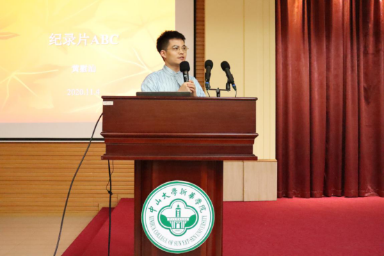 11月4日晚,由中山大学新华学院主办,艺术设计与传媒学院承办的纪录片《一对德国父子的客家传奇》赏析暨导演交流会在东莞校区定静楼讲学厅举行。本次讲坛由2018级网络与新媒体专业(以下简称“网新”)专业主任、纪录片导演黄慰汕担任主讲人,艺术设计与传媒学院院长兼党总支书记蔡照波、副院长周国屏、办公室主任潘倩莹、团委书记陈捷云出席交流会。网新专业班主任汪文超主持。网新专业各年级学生参会学习。