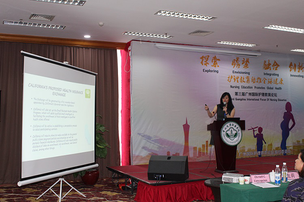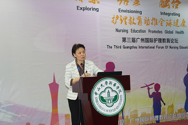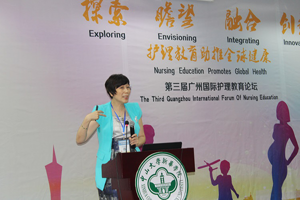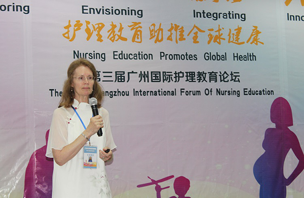 原美国加利福尼亚大学护理部副主任、中山大学新华学院医学系首席教授Susan H.Neidlinger作《如何成为国际化护士:机遇和挑战》专题报告。Susan H.Neidlinger教授向与会嘉宾分享了她的成长故事。从护理专业入门、全国学生护士协会董事会竞选、临床护理研究,并讲述了在全国学生护士协会董事会的三年经历,孕育了她的领导能力等等。从自身成长经历总结了培养国际化护士的经验。