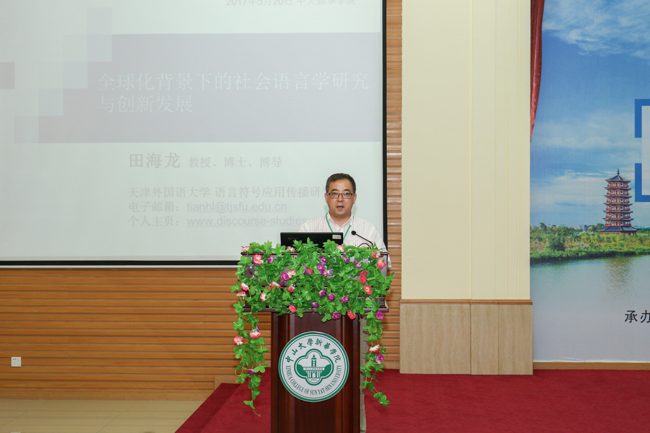 中国社会语言学会会长、中国英汉语比较研究会话语研究专业委员会副会长兼秘书长田海龙教授作题为“全球化背景下的社会语言学研究与创新发展”的学术报告