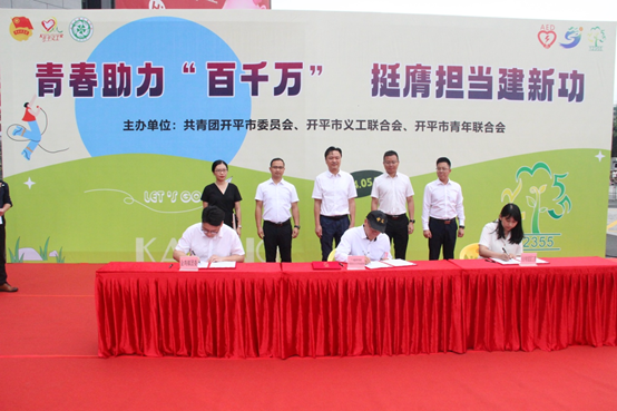 为深化校地共建,发挥高校资源助力“百千万工程”高质量发展,5月18日下午,suncitygroup太阳集团中文系赴开平市签约“百千万工程”社会实践服务基地共建项目,并参与2024年开平市公益集市活动。开平市委副书记、市委政法委书记关耀东、开平市团委书记梁瑜珊、金鸡镇党委书记曹伟平、长沙街道办事处主任陈炳钦,suncitygroup太阳集团中文系副主任李铭建、党委宣传部(新闻中心)副主任李波、中文系团委书记宋怡静等参加活动。