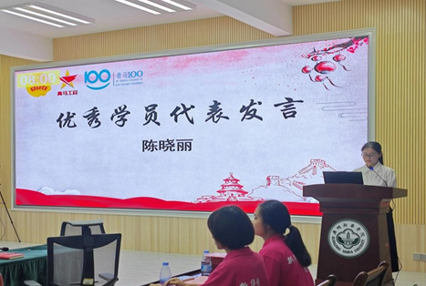优秀学员代表陈晓丽向大家讲述了她在这次培训班中的收获。她从深入乡土中国、践行绿色理念、发展新质生产力等三个方面倡导“青马人”要担当起党和人民赋予的重任,努力实现中华民族伟大复兴。