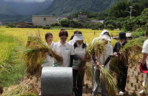 在稻谷成熟之时,山水菌缘社会实践队在金色的稻田里直播割稻,进行割稻研学活动。通过镜头,将水稻收割的辛勤过程直观展现给广大观众,让大家深刻体会到粮食的来之不易。