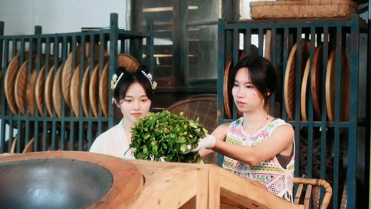 “英”地制宜社会实践队在红旗茶厂拍摄炒茶的短剧片段
