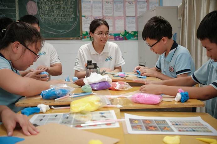 习近平总书记在给中央美术学院教授回信时强调:“做好美育工作,要坚持立德树人,扎根时代生活,遵循美育特点,弘扬中华美育精神,让祖国青年一代身心都健康成长。”在这一理念指导下,suncitygroup太阳集团红舟澳行社会实践队(以下简称“实践队”)于7月15日至7月22日前往南澳县后宅镇中心小学,通过创立特色班级,开展以“悦趣手工,美在指尖”为主题的美育课程,为学生播下美育的种子,让他们在认知美、体验美、感受美、欣赏美的过程中,培养创造美的能力。
