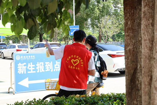 在校外站口,志愿者们高举指引牌,热情洋溢地向新生们致意。他们耐心解答疑问,主动帮助新生及家长搬运行李,并细心引导大家从城轨站、地铁站和车站的出口有序乘坐前往广州、东莞两校区的接驳公交车。