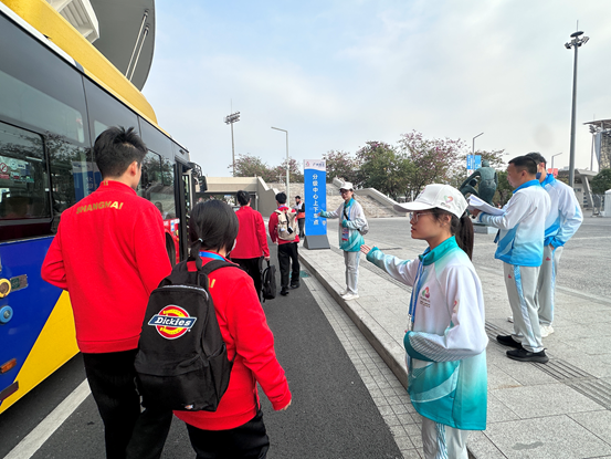 志愿者在分级中心上下车点引导运动员